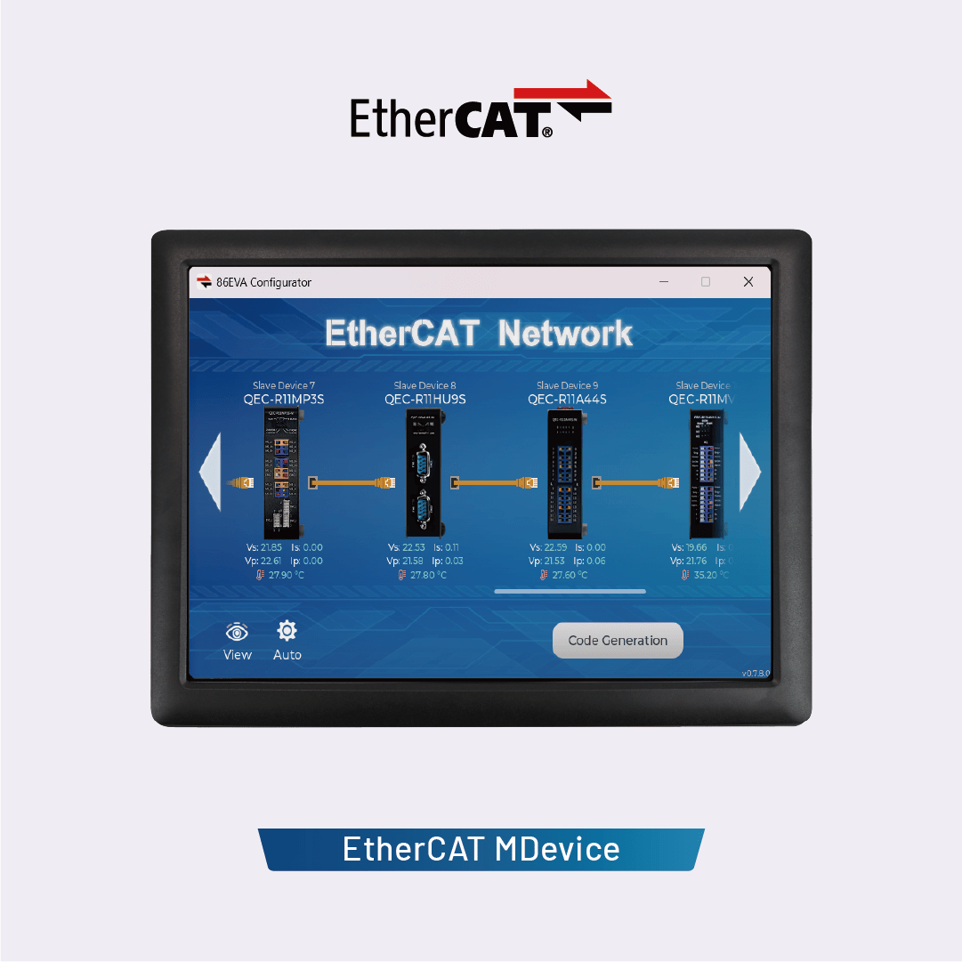 The QEC MDevice supports essential EtherCAT functions including PDO, CoE, FoE, Distributed Clocks (DC), and etc., ensuring flexible integration with third-party EtherCAT devices such as servo drives and digital I/O. With a minimum cycle time of 125 μs and jitter of less than 1 μs (via the 86Duino IDE), it is ideal for highly synchronized motion and I/O control applications.